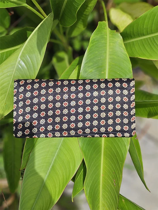 Made from Mashru silk, our Black Flower Dots Ajrakh wallet is decorated with flower dot motifs. The lightweight feel and easy-to-use design of the wallet make it a stylish accessory for organizing your daily essentials.