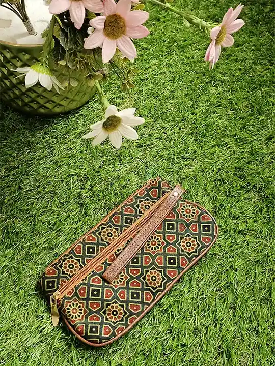 The Green Starflower Ajrakh Mashru Silk Pouch is a lightweight and stylish accessory from Nivra made from rich Mashru silk. It features starflower Ajrakh prints and is designed for daily use. It has a zip compartment at the back and inner pockets to keep your essentials organised.