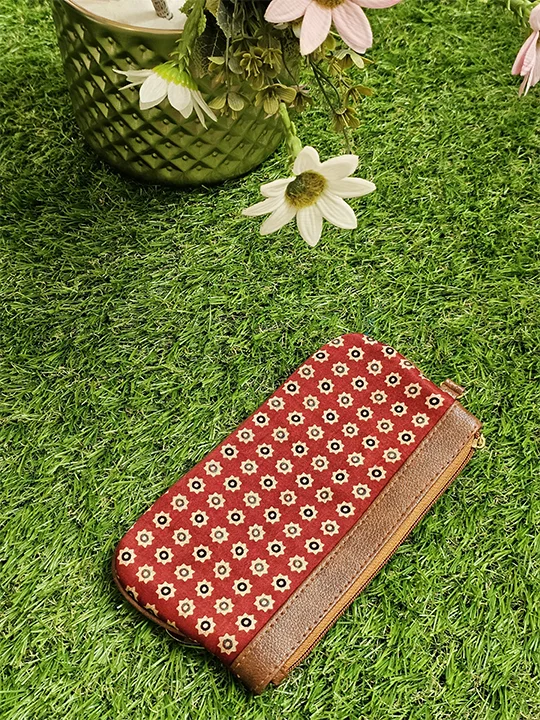 This Red Flower Dots Ajrakh Pouch is made from smooth, shiny Mashru silk. This Indian pouch is lightweight and has a side handle for carrying it effortlessly. It also has inner compartments as well as a zip on its back side, which gives you extra space to keep things safe and organised.