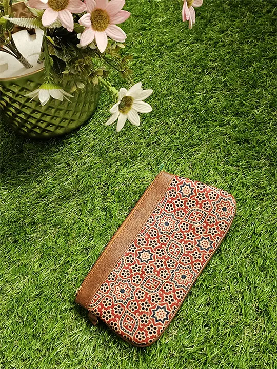 Handcrafted from Mashru silk, our Red and Blue Small Floral Ajrakh Pouch features a floral design. This wallet is designed for convenience and has a side handle for easy carrying. Also, the silk pouch includes a backside zip and extra compartments to keep your essentials neat and secure.
