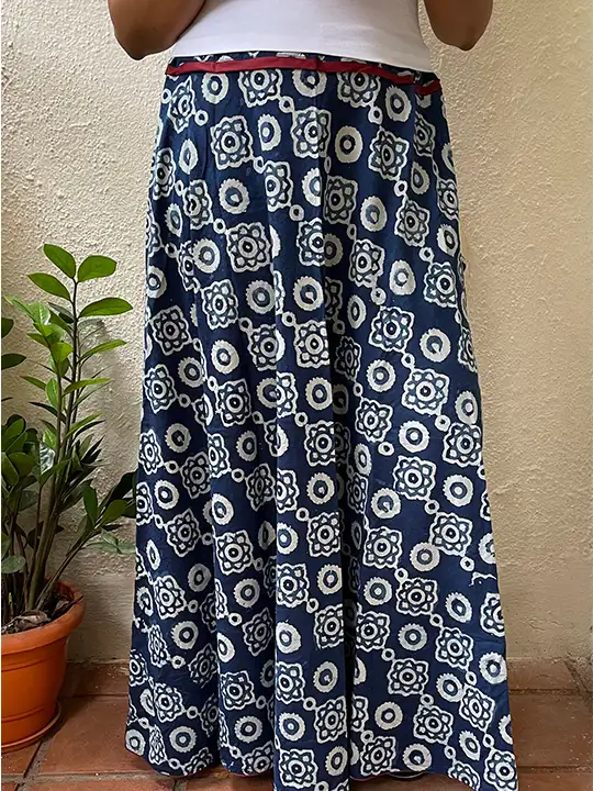 A comfortable hand-block printed indigo skirt that adds a graceful flare to complete your look.